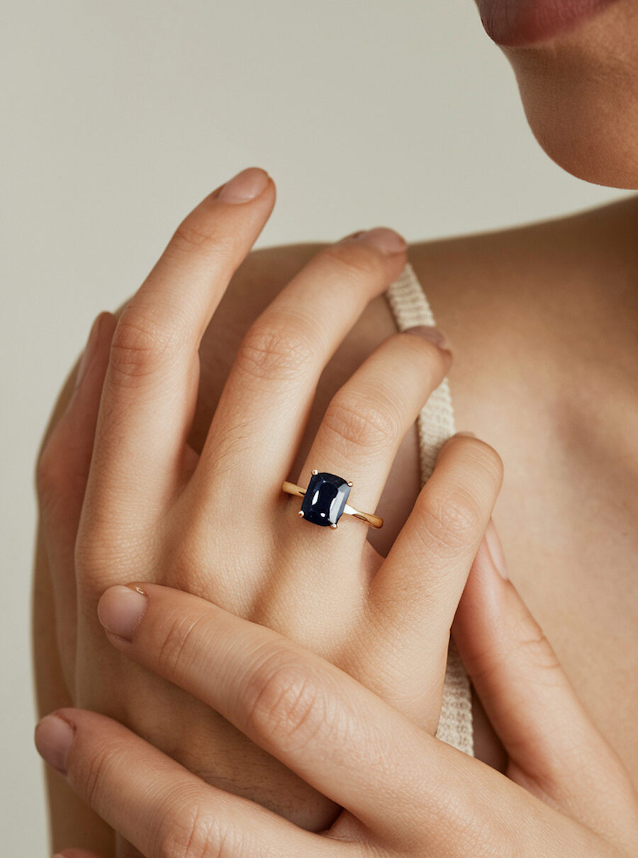We are swooning over the surprisingly-affordable, and on-trend stunning lab made rings at Dorsey including this Petite Spencer lab white sapphire ring and the Hastings lab blue sapphire ring.