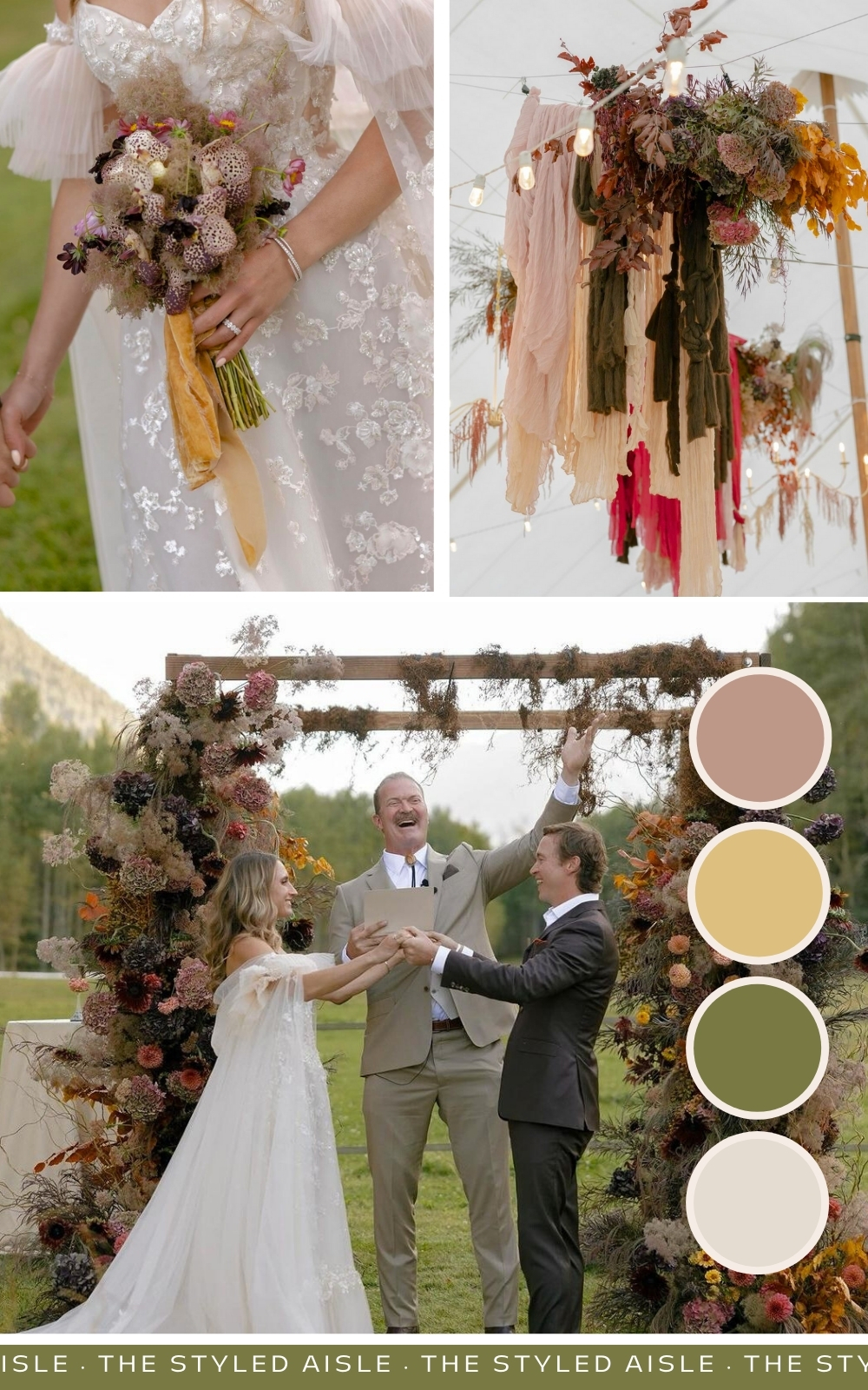 Earthy tones meet cozy fall vibes in this palette of lilac blush, goldenrod, olive green and soft beige. It’s perfect for a boho-chic celebration under the open sky.