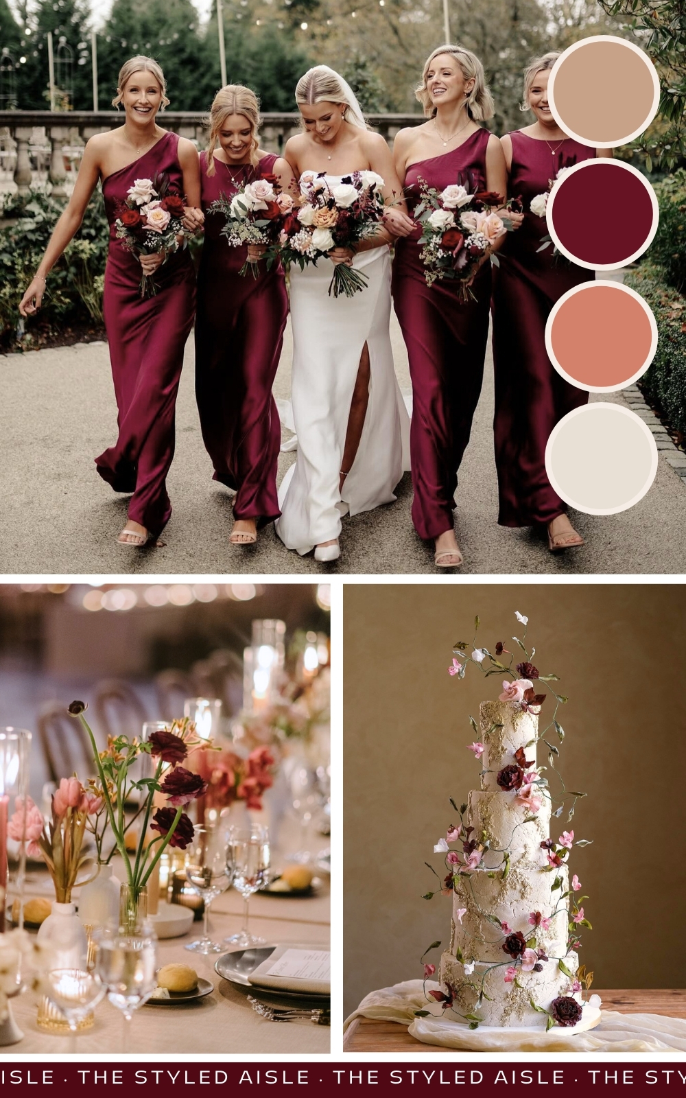 Deep, rich merlot meet soft pink in this romantic palette, balanced with neutral beige and splashes of gold for a refined touch. Perfect for vineyard weddings or elegant ballrooms.