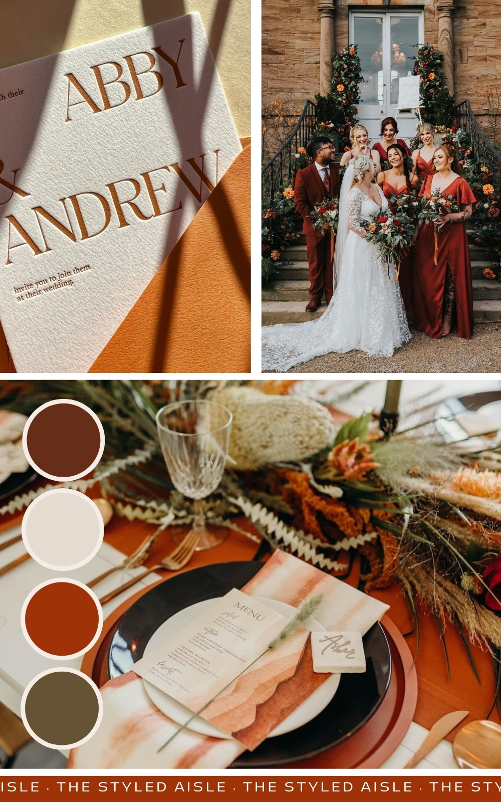 For the modern rustic bride, this earthy palette of terracotta, burnt orange, and sage green brings warmth and depth to your decor.