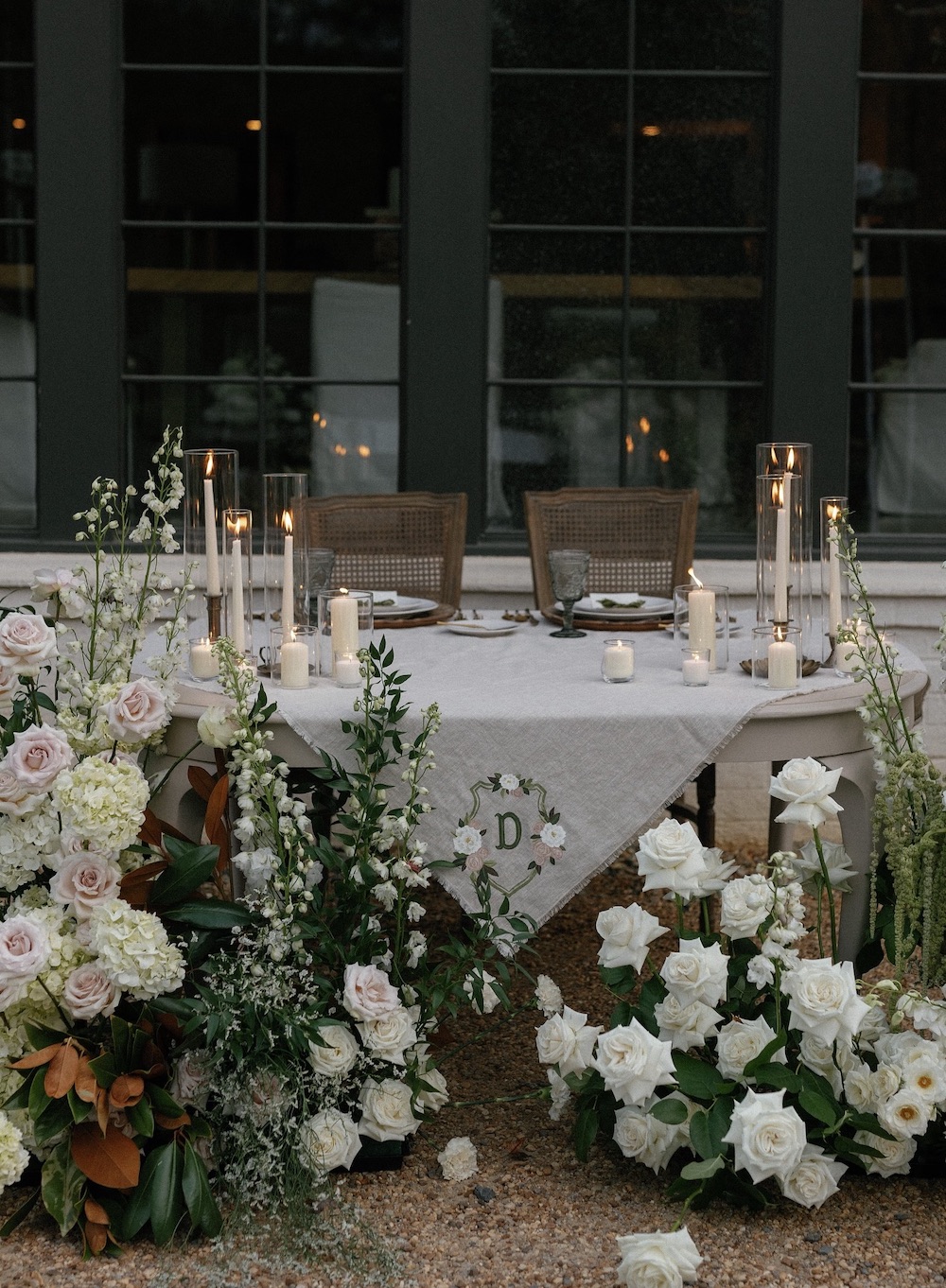 Imagine walking into a romantic and quaint garden oasis where white roses and blush florals frame a candlelit table head table for the bride and groom. The key to achieving this look is layering candles of different heights in glass holders for a soft, glowing ambiance.