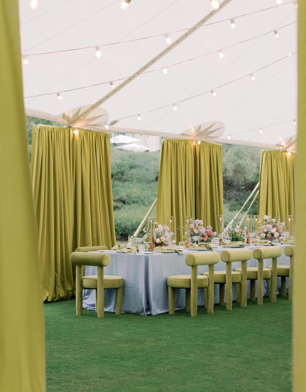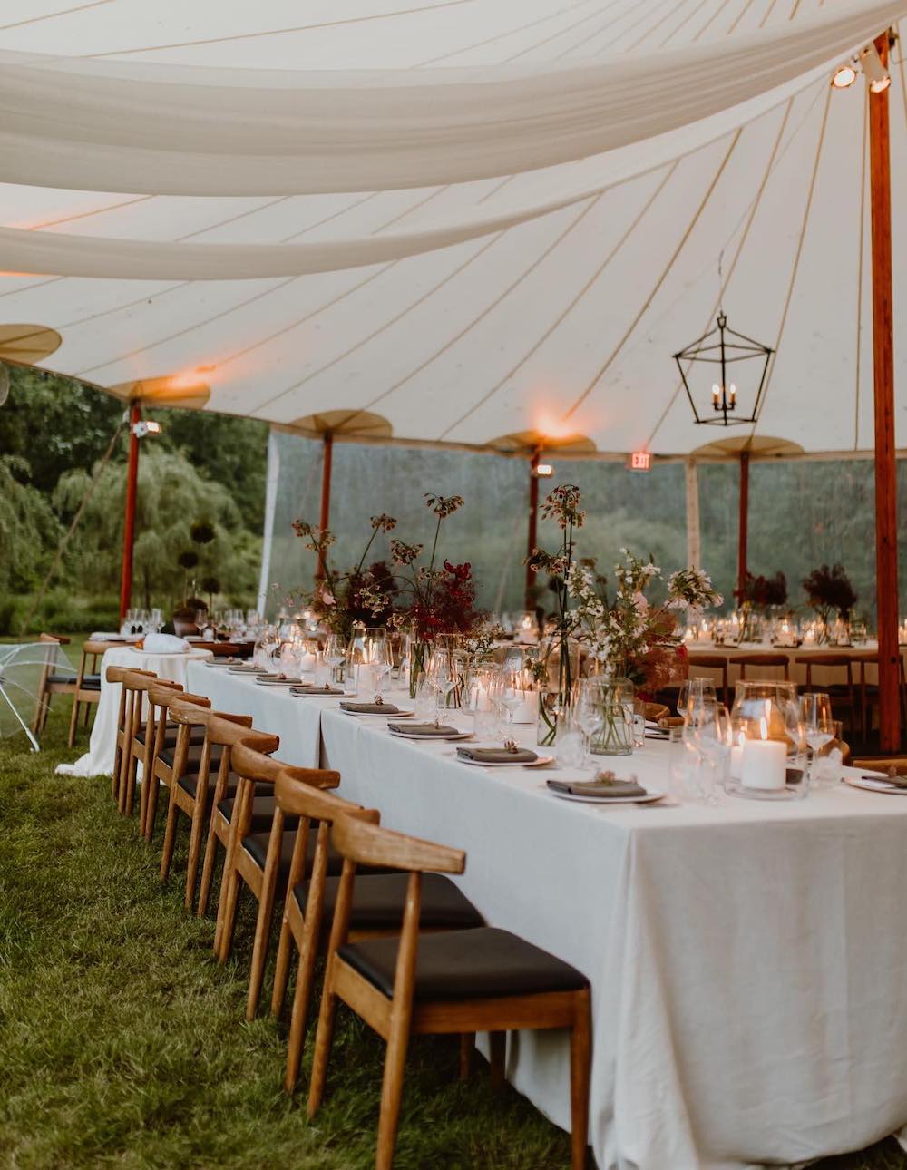 Elevate the tent with draped fabric, string lights, and go with wildflower centerpieces for a boho-chic touch. We love the choice of wooden chairs and minimalistic table settings for rustic charm.
