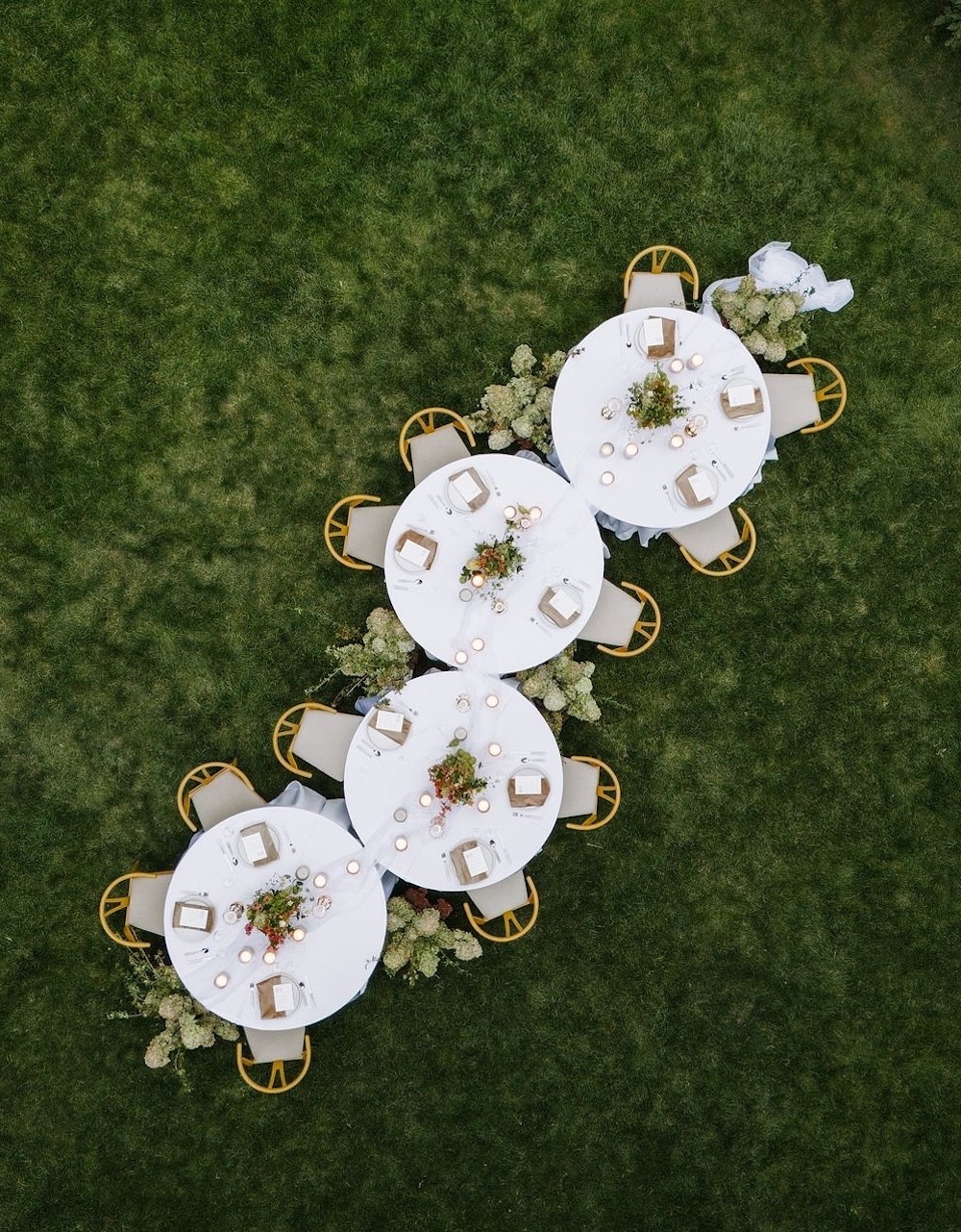 If you don’t have a lot of space in your backyard setting and your guest list is small, opt for a pretty train of circular tables. Rather than one long rectangular table, the circular table option provides the ability to add or take away seating.