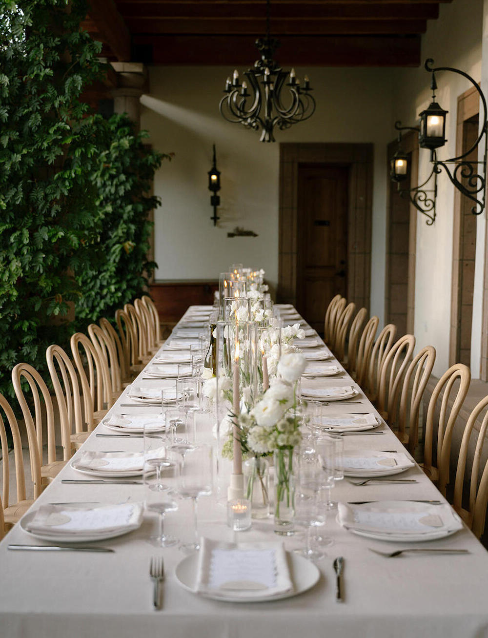 In contrast to the previous idea, long banquet tables dressed in crisp white linens and accented with soft florals create a Mediterranean-style outdoor dining experience. It will truly feel like you are at a family winery in Italy!