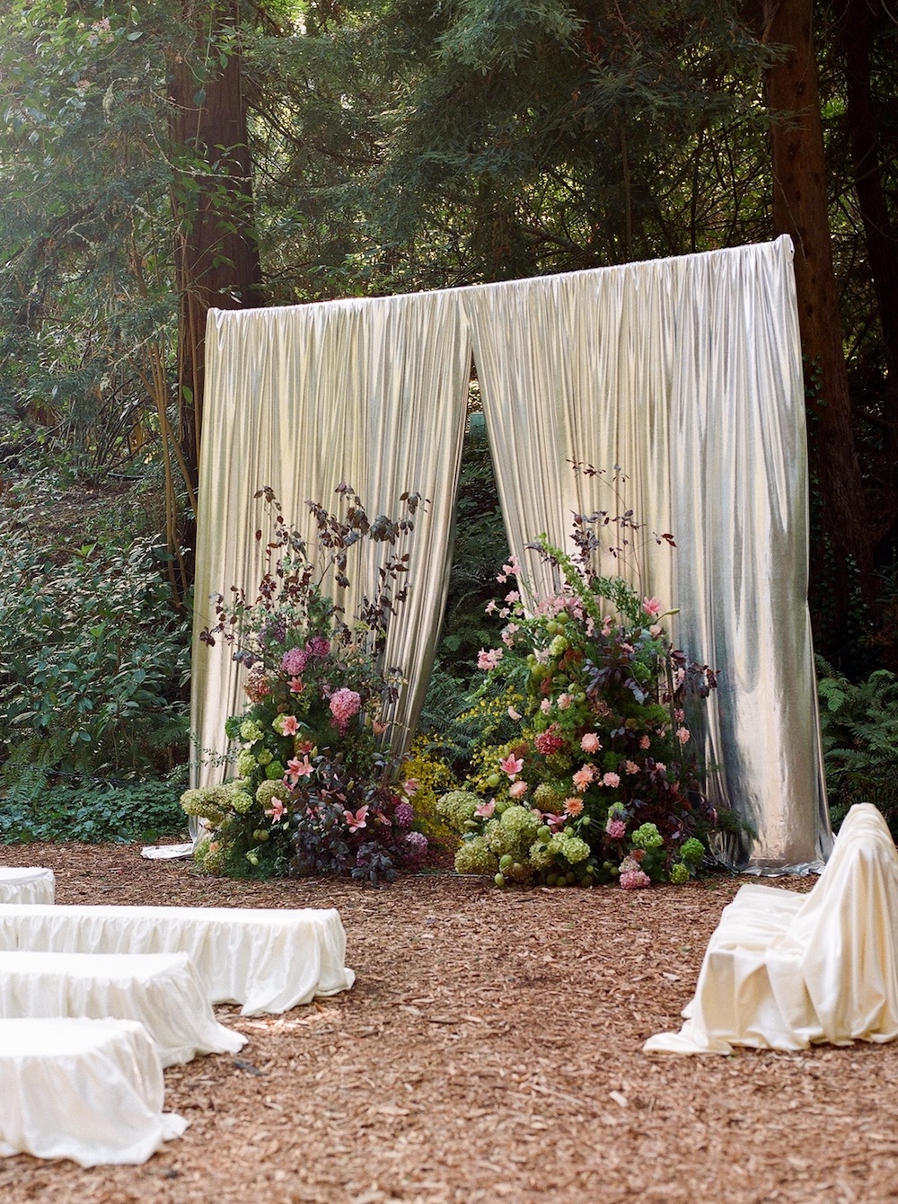 Elevate your backyard into an enchanted forest with a metallic-draped altar backdrop and dramatic floral arrangements. We love the use of earthy tones and textured fabrics to blend luxury with natural beauty.