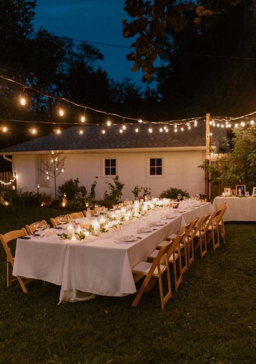 Create a dreamy, intimate vibe by draping string lights across your backyard. This simple yet stunning idea works perfectly for evening receptions.