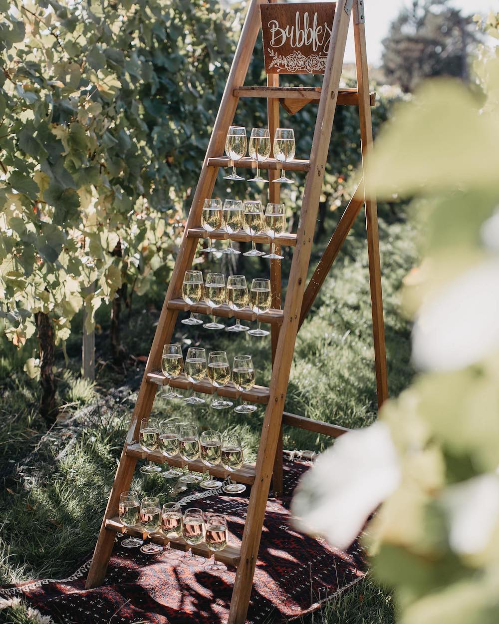Transform your backyard into a mini vineyard with this clever “bubbles bar” idea. Use a rustic ladder to display rows of champagne glasses for a fun self-serve station.