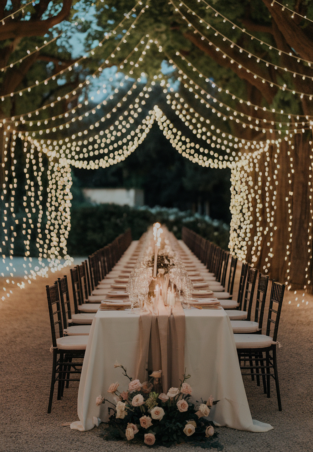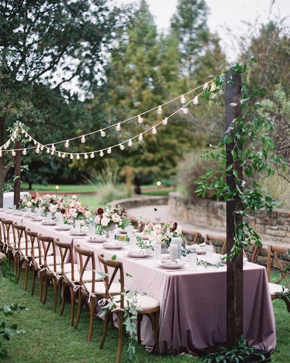 If you are lucky enough to have large trees in your yard or garden, make a beautiful tunnel of string lights to drape above the guest tables. This looks especially nice with a very long table set up.