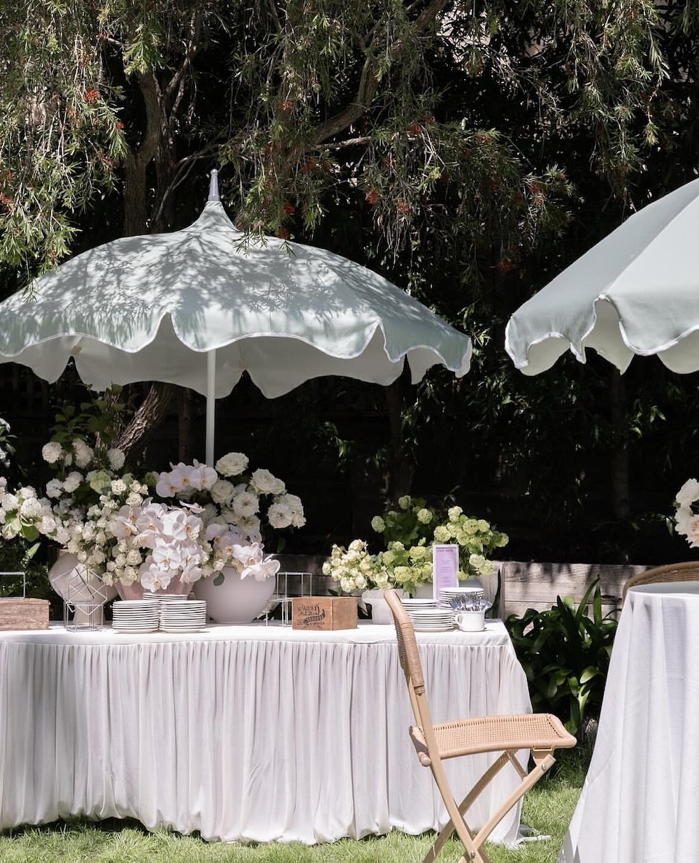 For our next idea, think airy and floral-filled. To recreate this whimsical look, incorporate scalloped parasols, crisp white table linens, and lush floral arrangements into your outdoor set-up.