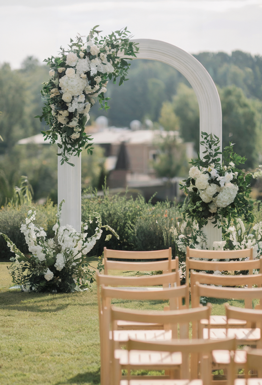As you step into a new chapter of your life with your significant other, why not stand under a beautifully decorated arch like this? We love the rounded wood, minimalistic floral decor, and pretty wood folding chairs.