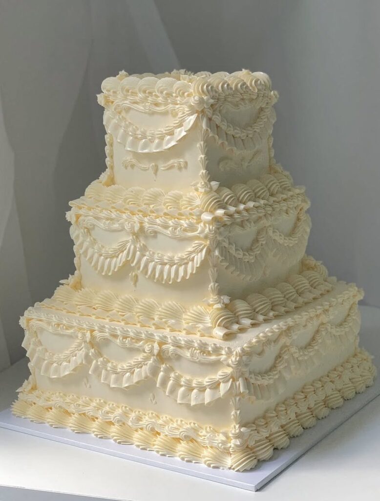 This square-tiered cake brings back the charm of old-school piping, with lavish swags, rosettes, and delicate details. If you love a nostalgic, vintage vibe, this cake is the perfect blend of timeless tradition and playful elegance.