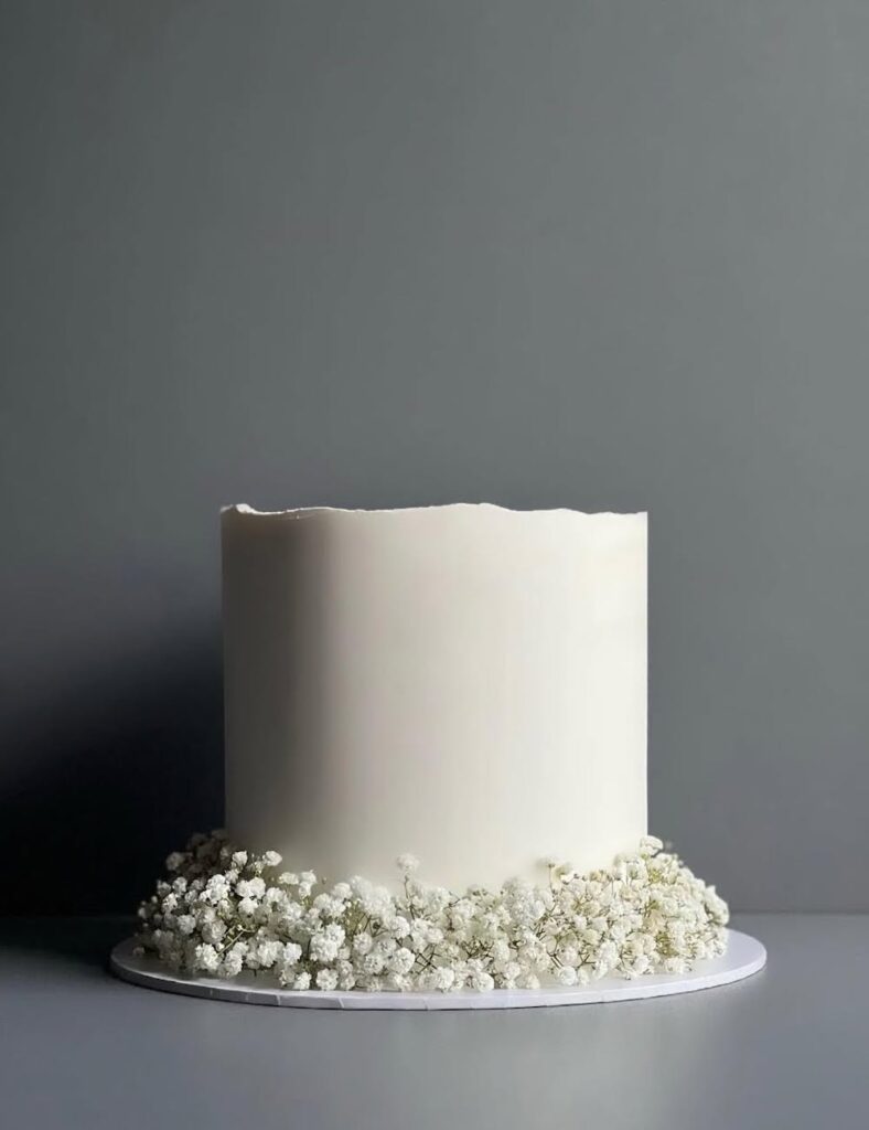Simplicity meets sophistication in this sleek, minimalist cake adorned with a delicate bed of baby’s breath. The soft torn edges add an organic feel, making it the perfect choice for a modern yet romantic celebration.