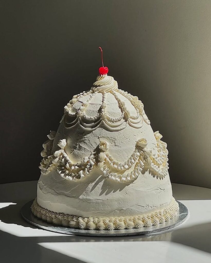 This unique dome-shaped cake is a statement piece, featuring intricate Lambeth-style piping and a single cherry on top. A playful yet elegant nod to vintage dessert trends!
