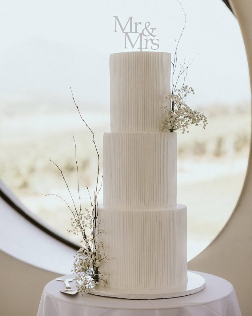 This tall and elegant cake features refined vertical textures and delicate baby’s breath, blending classic charm with a contemporary aesthetic. A timeless beauty for a picture-perfect wedding!